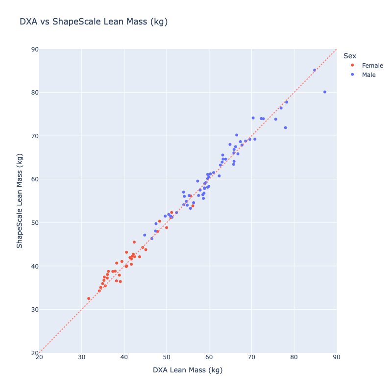 Similarly, ShapeScale predictions were closely matched with DXA-derived lean mass: