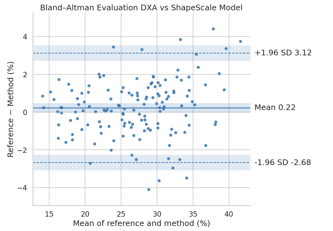 ShapeScale predictions showed strong agreement with DXA-derived body fat percentage: