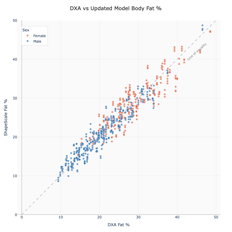 ShapeScale predictions showed strong agreement with DXA-derived body fat percentage: