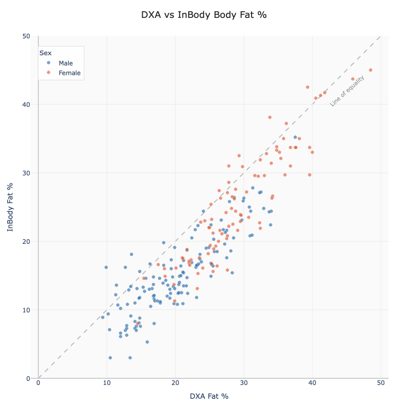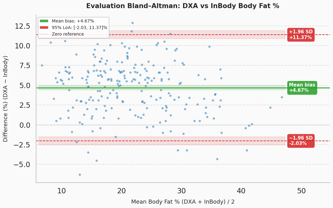 In comparison, four-point Bioelectrical Impedance Analysis (BIA) estimates from the InBody Dial H20 Smart Body scale showed lower accuracy relative to the DXA reference: