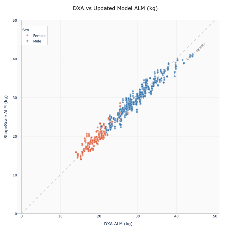 ShapeScale demonstrated strong agreement with DXA for ALM, accurately capturing limb muscle mass distribution from surface geometry and basic demographic inputs. This enables non-invasive assessment of muscle health and supports large-scale screening for sarcopenia and related conditions.